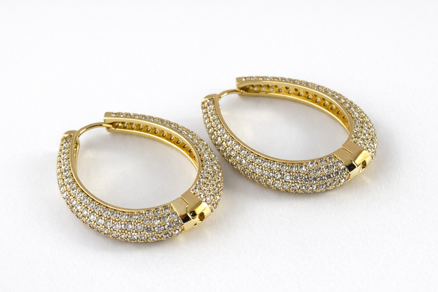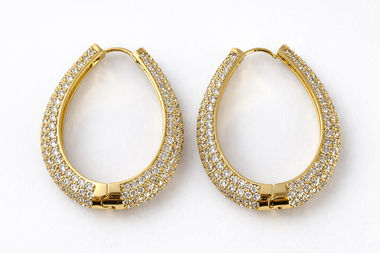 These statement hoops feature a bold curved silhouette covered in high-shine pavé stones that reflect light beautifully from every angle. The secure hinge closure ensures comfort and stability while maintaining a luxurious finish.