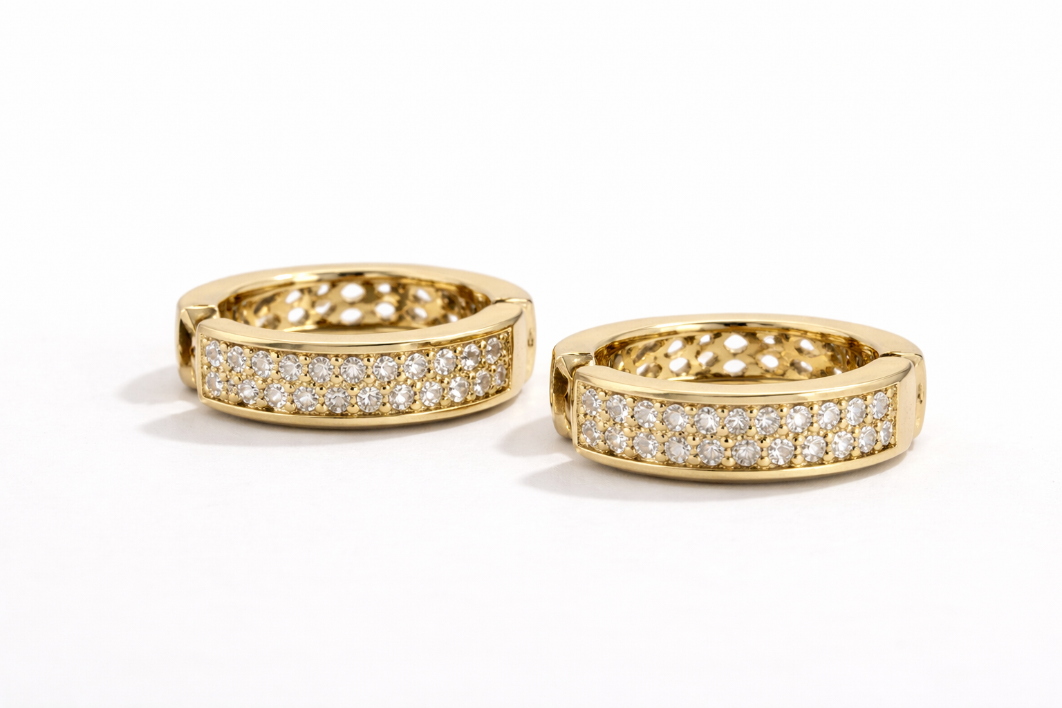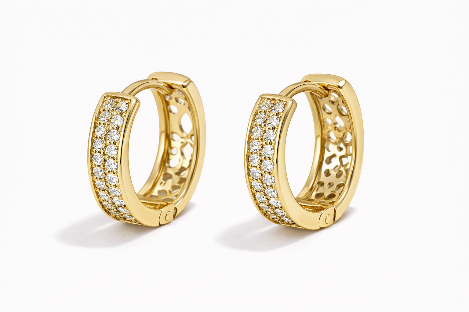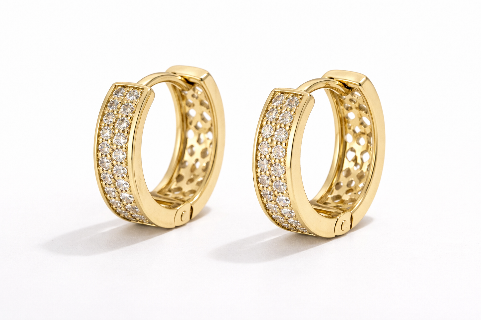 These elegant huggie hoops feature a full front pavé of sparkling cubic zirconia stones, delivering refined brilliance from every angle. The smooth polished gold edges frame the stones beautifully, creating a luxurious, modern silhouette.