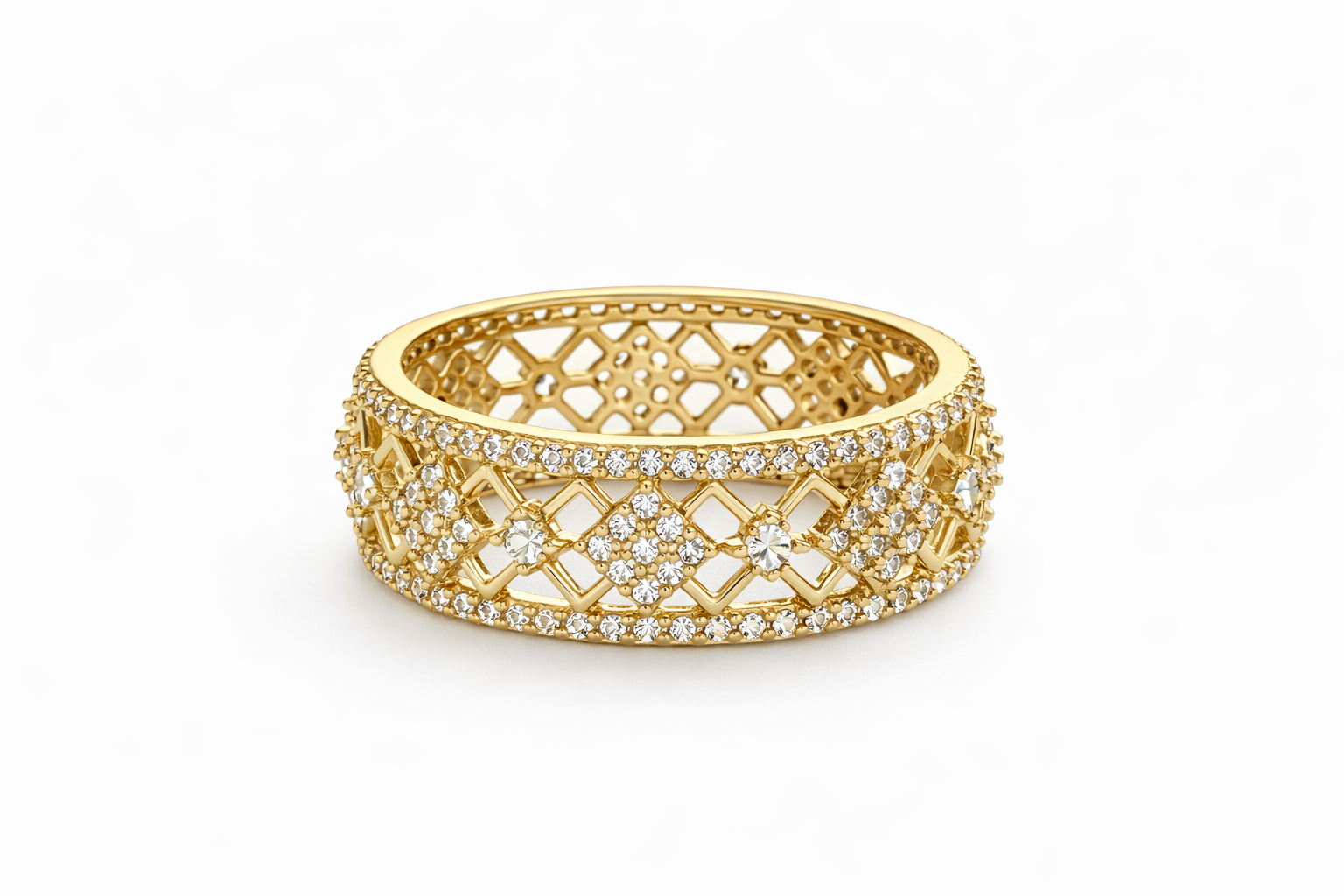 Design: Open lattice eternity band with cross-inspired clusters