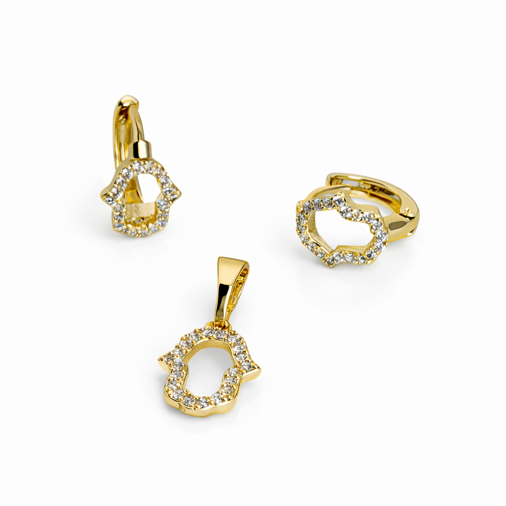 Beautiful 14K Gold Laminated Hamsa jewelry set for girls, featuring sparkling cubic zirconia earrings and pendant. Available with or without a 35cm chain. A meaningful and elegant piece that symbolizes protection, perfect for gifting and everyday wear.