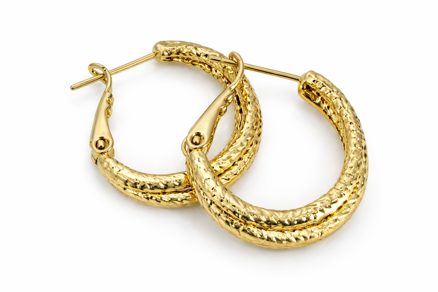Estos aretes tipo hoop con textura martillada son perfectos para elevar cualquier look. Su diseño doble y acabado brillante les da un toque sofisticado sin ser exagerados. Ideales para uso diario o para ocasiones especiales.