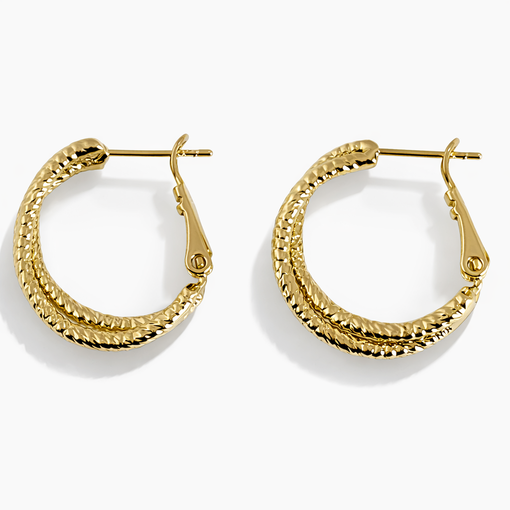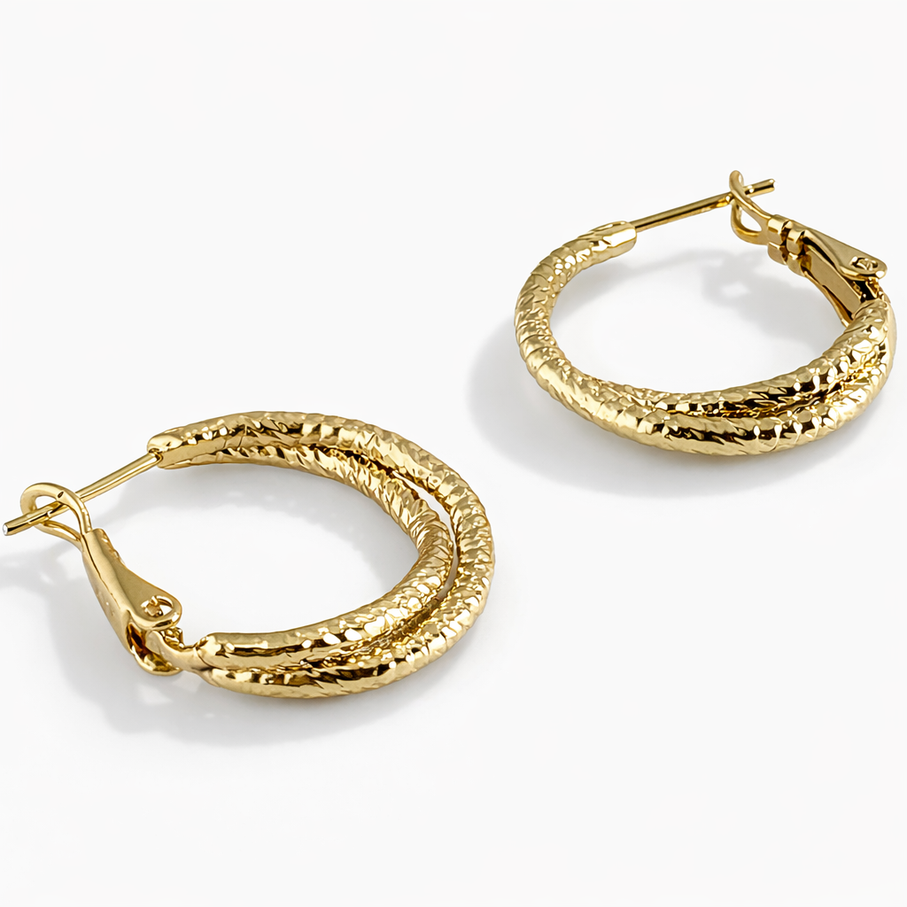Elegant 14K Gold Filled textured hoop earrings with a hammered double-layer design. Lightweight, durable, and perfect for everyday luxury styling.