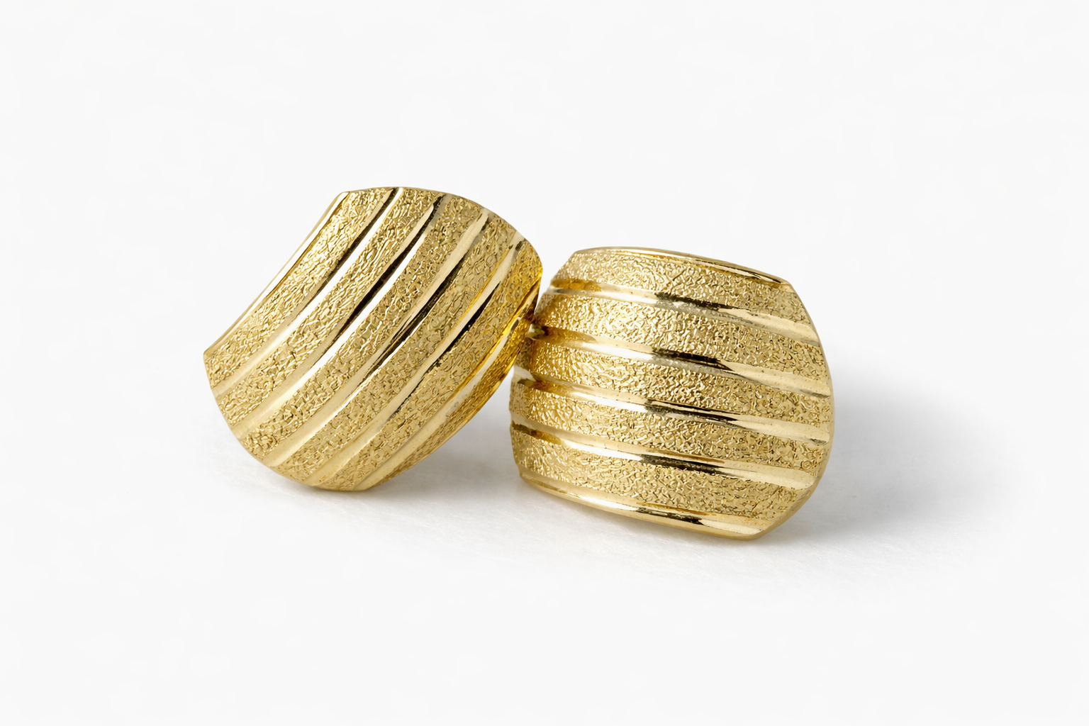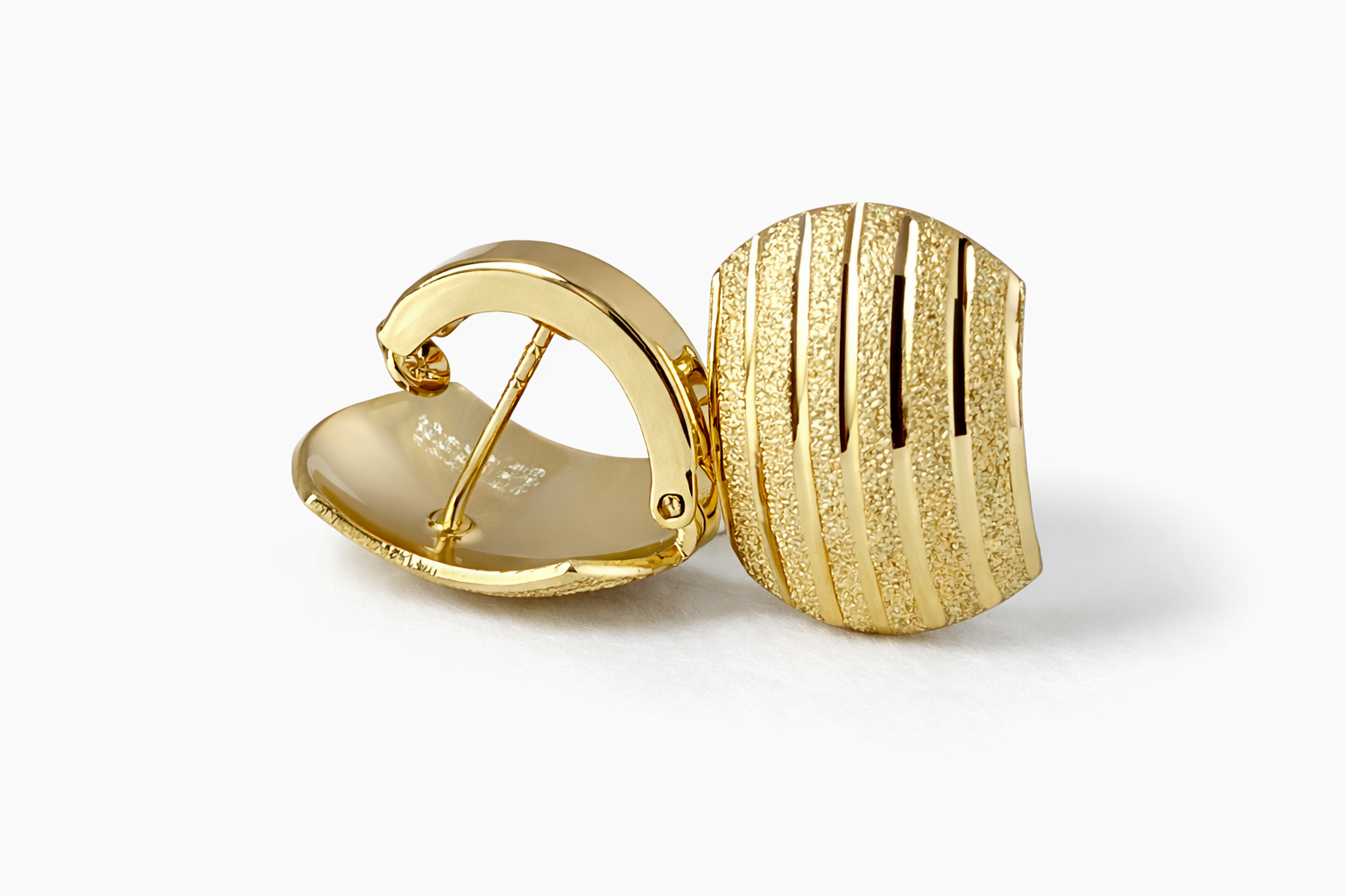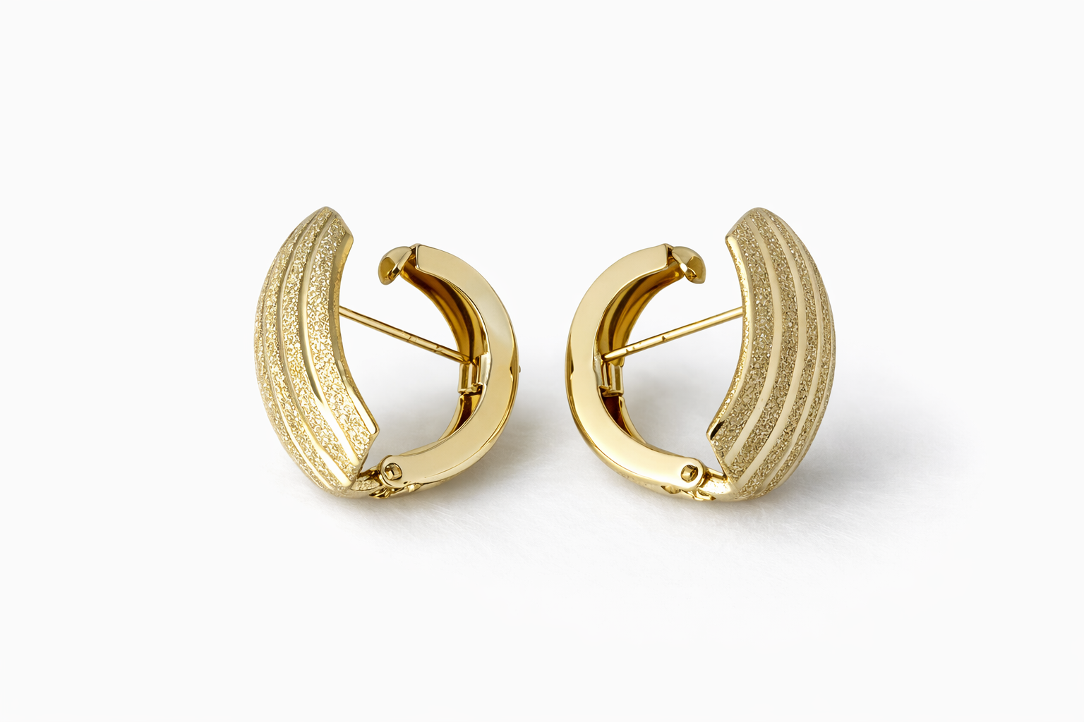 These elegant mini hoops feature a unique curved silhouette with alternating polished and textured stripe detailing, creating a subtle yet sophisticated contrast that catches the light beautifully.