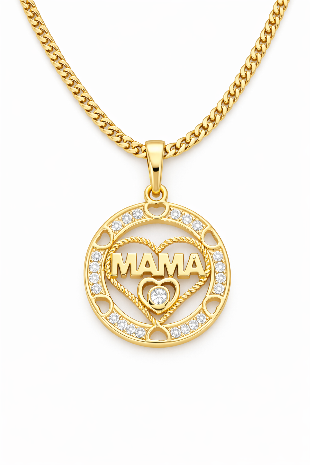 Crafted with a high-quality 14K Gold Laminated, this beautiful pendant features a delicate circular design adorned with sparkling cubic zirconia stones and subtle heart details surrounding the word “MAMA” at the center. Each element symbolizes love, strength, protection, and the unbreakable bond between a mother and her child.