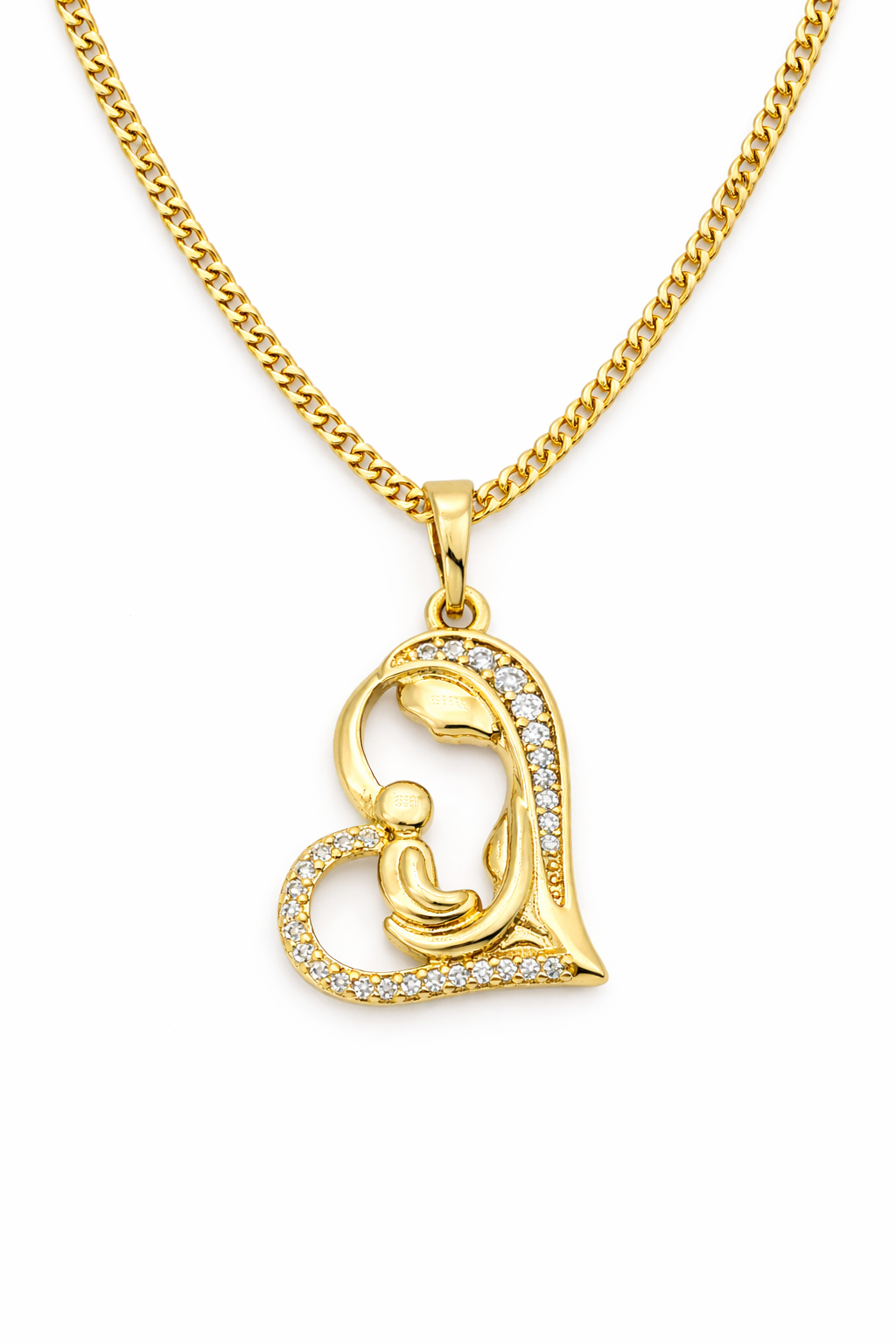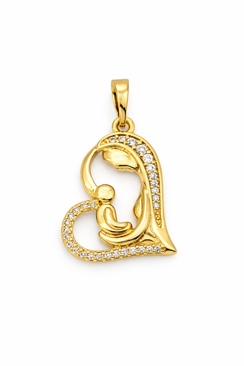 Expertly crafted in 14K Gold Laminated, thiLayered Finish, elegant pendant features a delicate heart silhouette that gracefully embraces a mother holding her baby. The design is accented with sparkling stones that add brilliance and sophistication, creating a refined piece that stands out while remaining beautifully delicate.