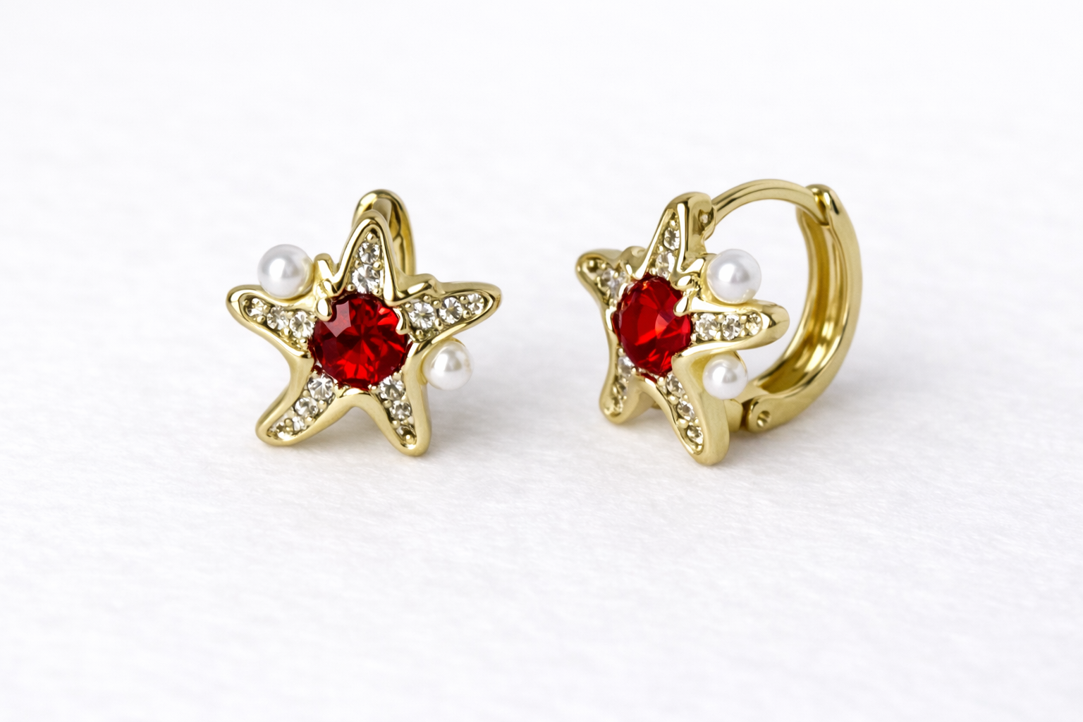 Estos hermosos aretes están elaborados en 14K gold filled, ofreciendo un acabado elegante y duradero. Su diseño de estrella de mar con piedras brillantes y delicados detalles en perla los hace perfectos para niñas y mujeres que buscan una pieza fina, delicada y diferente.