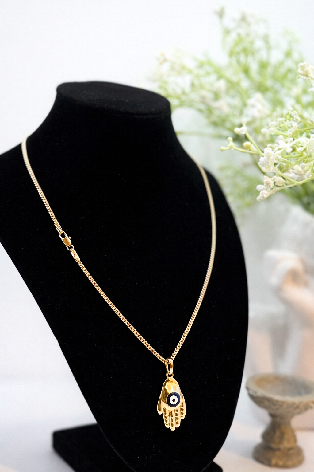 The necklace features a polished Hamsa hand charm with a striking blue Evil Eye detail at the center — symbolizing protection, positivity, and spiritual balance.