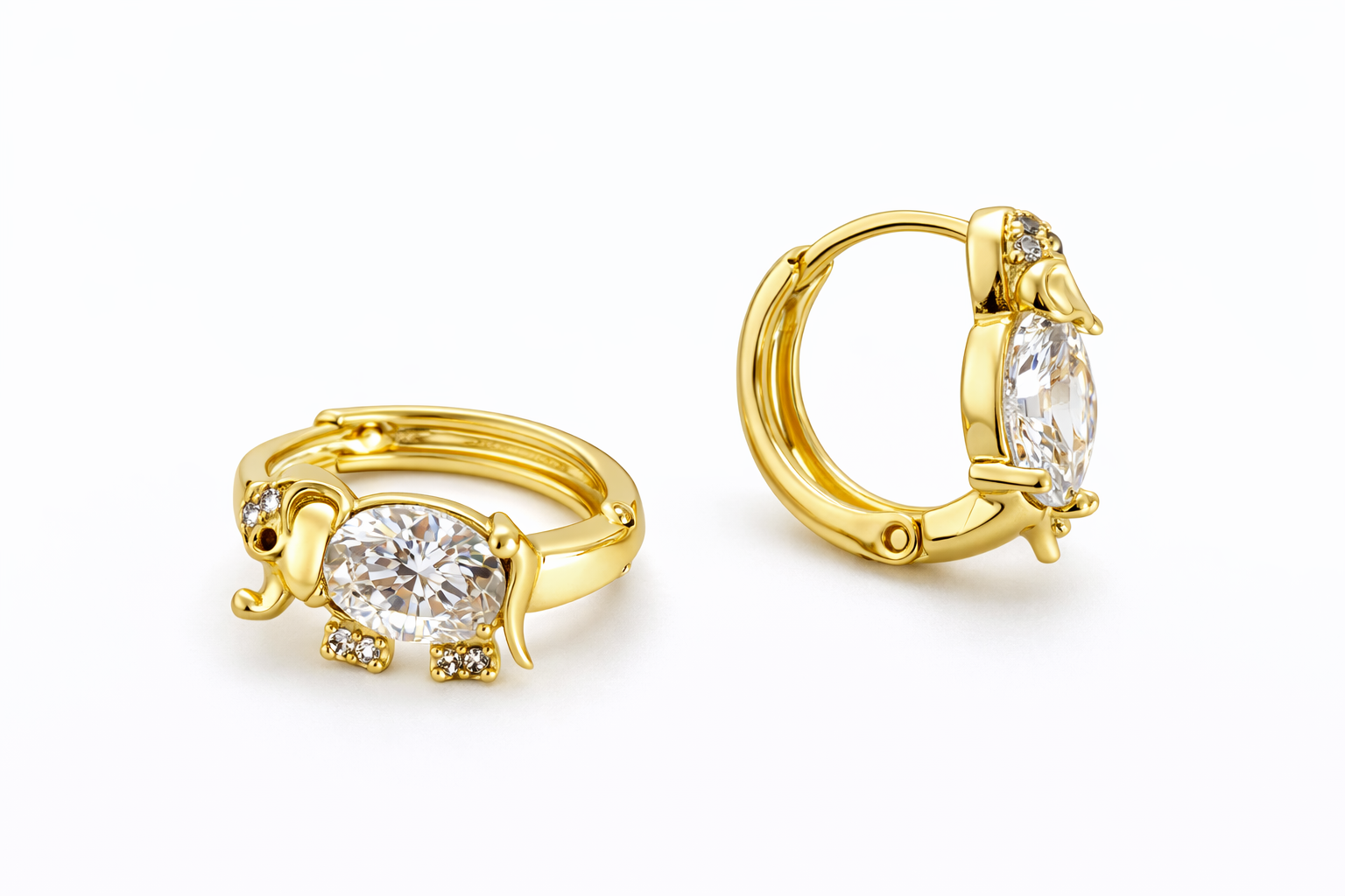 Aretes tipo huggie en forma de elefante elaborados en oro laminado 14K, con cristal central brillante y delicados detalles en micro zirconias que aportan un acabado fino y elegante.