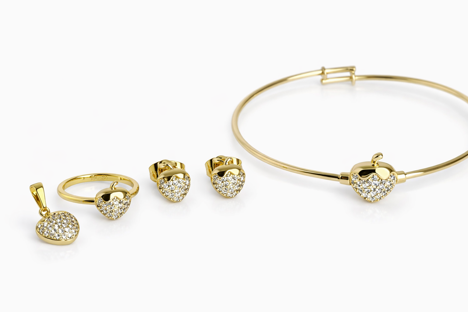 Cute 14KGold Laminated, strawberry baby jewelry set with sparkling zirconia earrings, pendant, ring, and bracelet. Available with or without a 35cm chain. Perfect gift for girls.