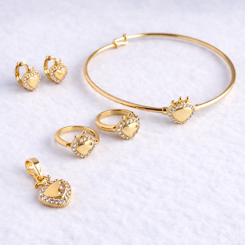 Este hermoso set de joyería con diseño de corazón estilo fresa 🍓 es perfecto para niñas que aman los accesorios delicados y elegantes. Está elaborado con un acabado laminado en Oro 14k , ofreciendo durabilidad y un brillo hermoso tipo oro real.