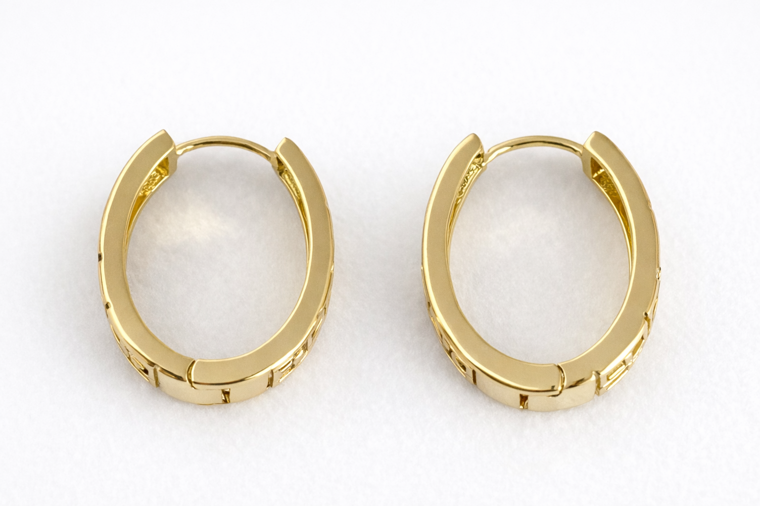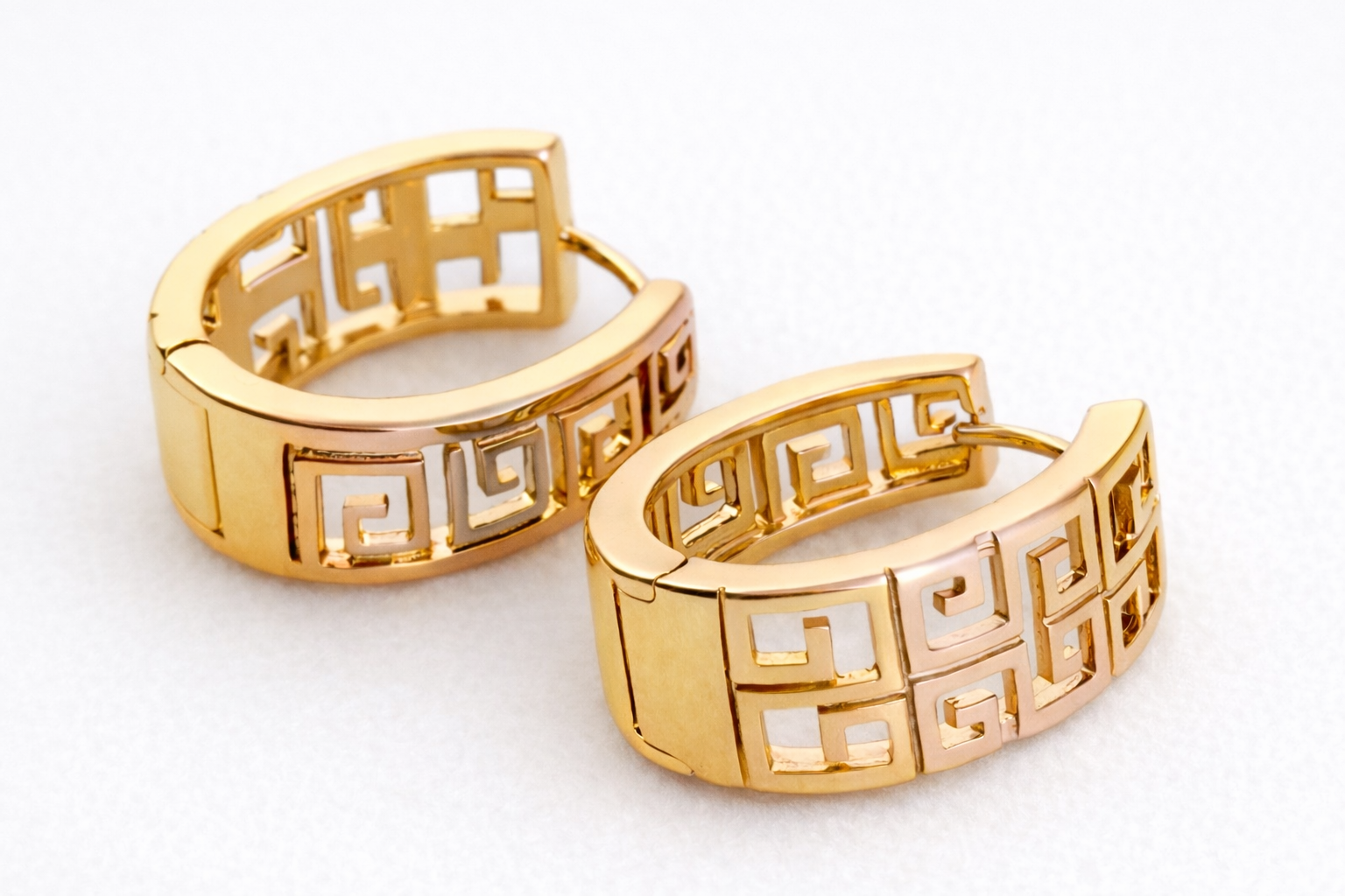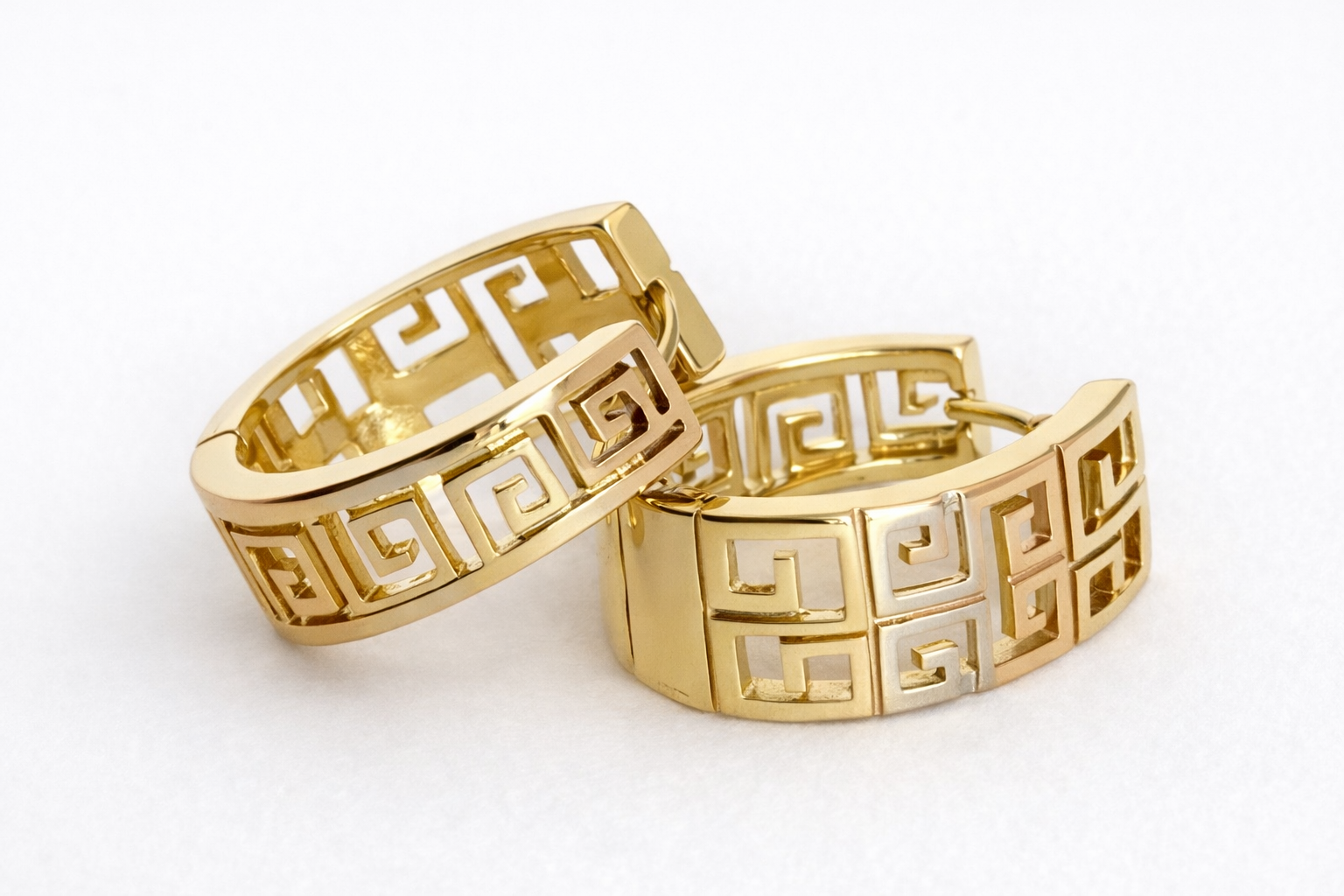 These structured hoops feature a detailed Greek key pattern symbolizing infinity and strength, enhanced with three-tone elegance: classic yellow gold, soft rose gold, and white gold accents.